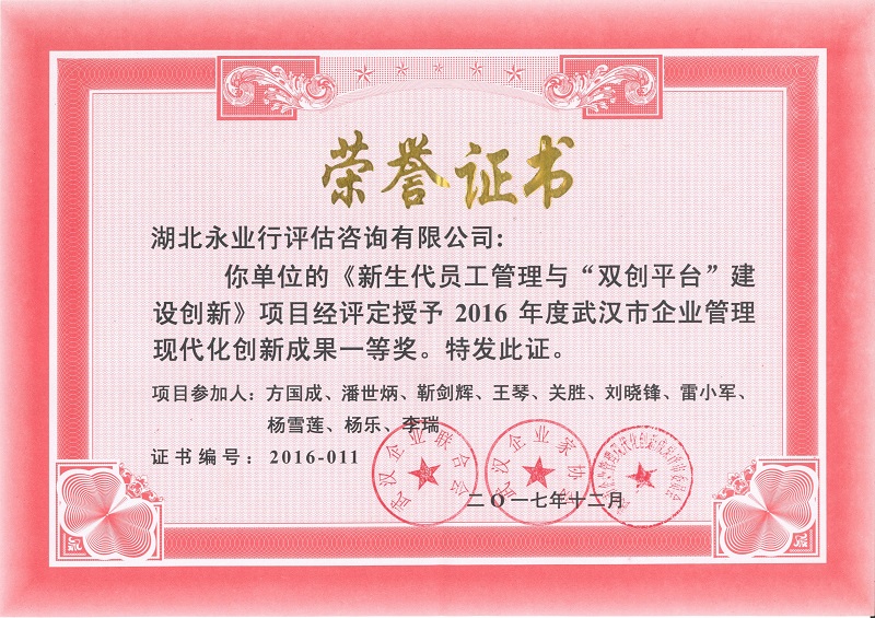 2018年1月10日,武漢企業(yè)聯(lián)合會、武漢企業(yè)家協(xié)會向社會正式發(fā)布武漢市第三十屆(2016年度)企業(yè)管理現(xiàn)代化創(chuàng)新成果獲獎項目,其中一等獎 12項、二等獎 43項、三等獎 19項。此次評選中,永業(yè)行作為民營企業(yè)與在漢央企、本地大型國企進(jìn)行角逐, 參評的 “新生代員工管理與 ‘雙創(chuàng)平臺’ 建設(shè)創(chuàng)新” 最終獲得一等獎,是唯一獲獎的咨詢評估機構(gòu)。