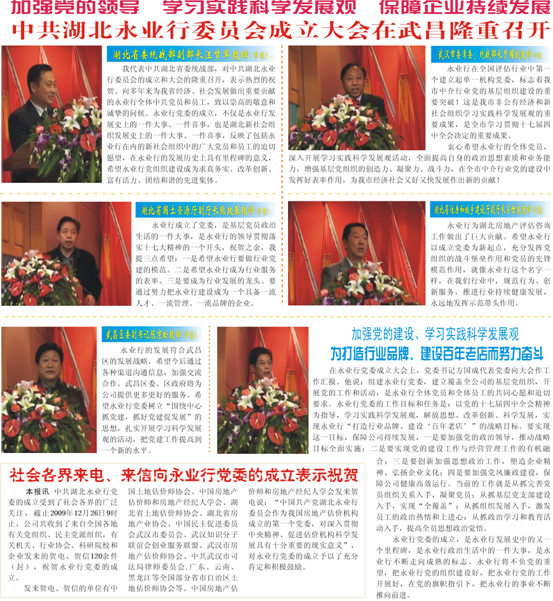 2009年12月26日,中國共產(chǎn)黨湖北永業(yè)行委員會成立大會在武昌隆重召開。湖北永業(yè)行黨委副書記、總裁潘世炳主持本次會議,中國土地估價師協(xié)會副會長秦海榮專程赴武漢致賀,大會在莊嚴(yán)的國歌聲中開幕。