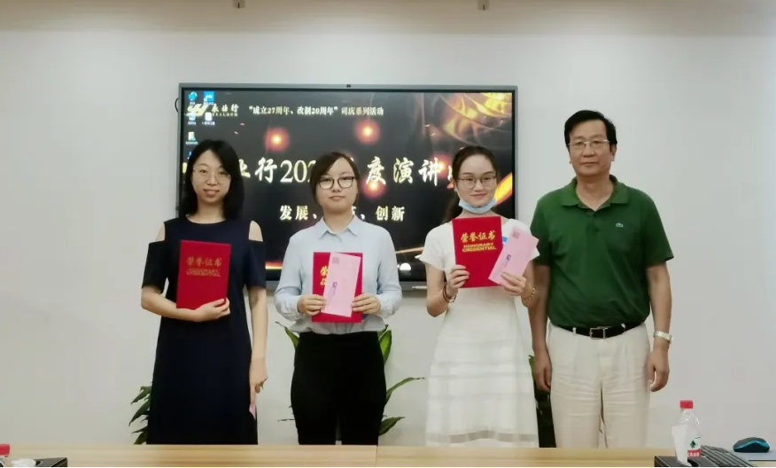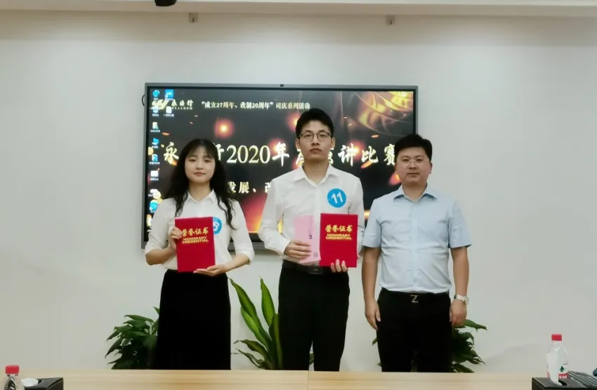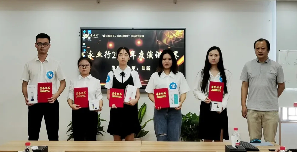值此永業(yè)行“成立27周年、改制20周年”之際,為充分展示“永業(yè)行人”的精神風(fēng)貌,激發(fā)廣大員工愛崗、敬業(yè)、奉獻的熱情,8月28日,永業(yè)行2020年度“發(fā)展、改革、創(chuàng)新”主題演講比賽正式拉開帷幕,來自總、分部的18名青年員工參加比賽,董事長、總裁潘世炳,副總裁雷小軍、靳劍輝、劉曉峰,業(yè)務(wù)部門負責(zé)人代表,2019年度永業(yè)行標兵及先進工作者代表作為評委出席比賽。