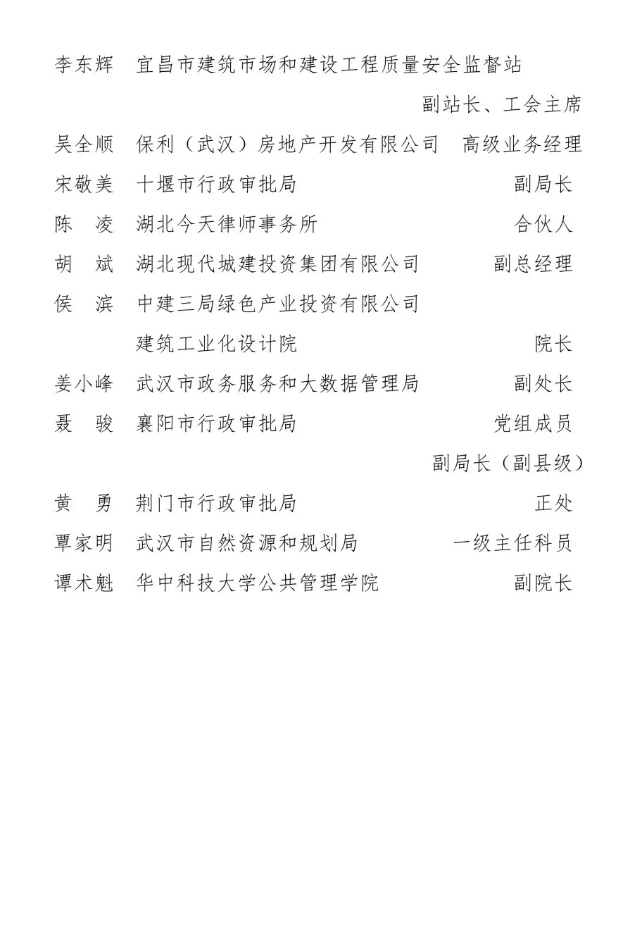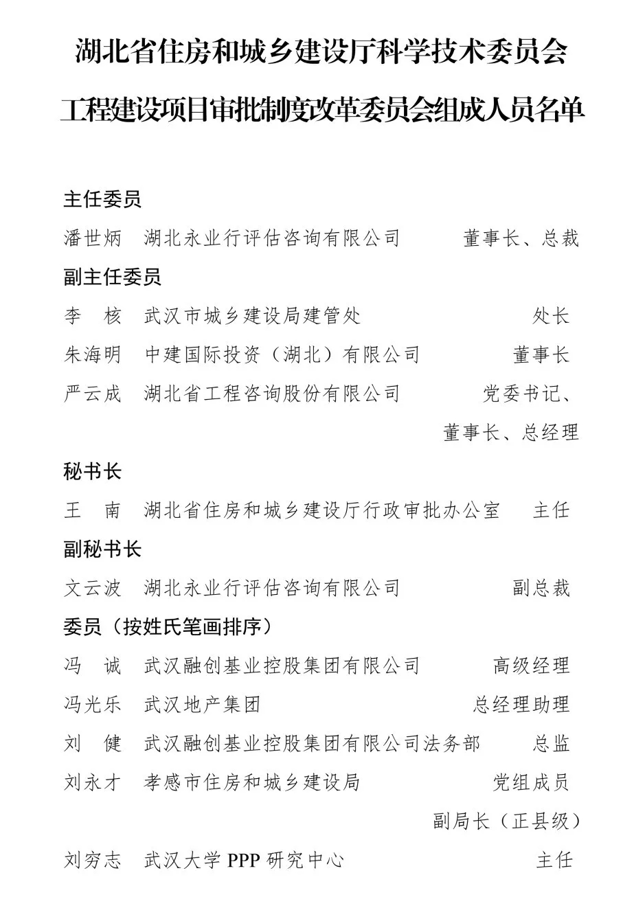 9月30日,省住房和城鄉(xiāng)建設(shè)廳發(fā)布《關(guān)于成立湖北省住房和城鄉(xiāng)建設(shè)廳科學(xué)技術(shù)委員會歷史文化名城等四個專業(yè)委員會的通知》,公布了住房和城鄉(xiāng)建設(shè)廳科學(xué)技術(shù)委員會歷史文化名城、質(zhì)量安全、工程建設(shè)項目審批制度改革、智慧住建等四個專業(yè)委員會委員名單,省房協(xié)會長、永業(yè)行董事長、總裁潘世炳獲聘為工程建設(shè)項目審批制度改革委員會主任委員,武漢市城鄉(xiāng)建設(shè)局建管處處長李核、中建國際投資(湖北)有限公司董事長朱海明、湖北省工程咨詢股份有限公司黨委書記、董事長、總經(jīng)理嚴(yán)云成獲聘為副主任委員,湖北省住房和城鄉(xiāng)建設(shè)廳行政審批辦公室主任王南、省村鎮(zhèn)建設(shè)協(xié)會副理事長、永業(yè)行副總裁文云波分別獲聘為秘書長、副秘書長。