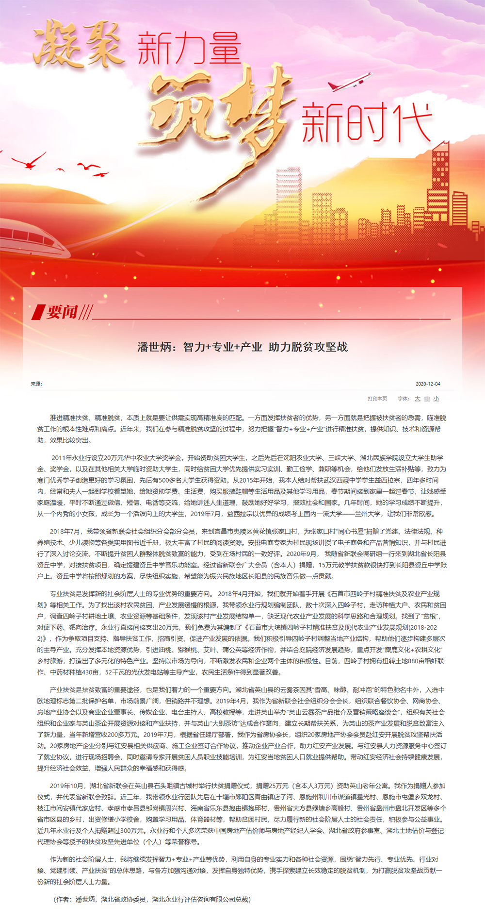 作為新的社會(huì)階層人士,我將繼續(xù)發(fā)揮智力+專(zhuān)業(yè)+產(chǎn)業(yè)等優(yōu)勢(shì),利用自身的專(zhuān)業(yè)實(shí)力和各種社會(huì)資源,圍繞“智力先行、專(zhuān)業(yè)優(yōu)先、行業(yè)對(duì)接、黨建引領(lǐng)、產(chǎn)業(yè)扶貧”的總體思路,與各方加強(qiáng)溝通對(duì)接,發(fā)揮自身獨(dú)特優(yōu)勢(shì),攜手探索建立長(zhǎng)效穩(wěn)定的脫貧機(jī)制,為打贏脫貧攻堅(jiān)戰(zhàn)貢獻(xiàn)一份新的社會(huì)階層人士力量。