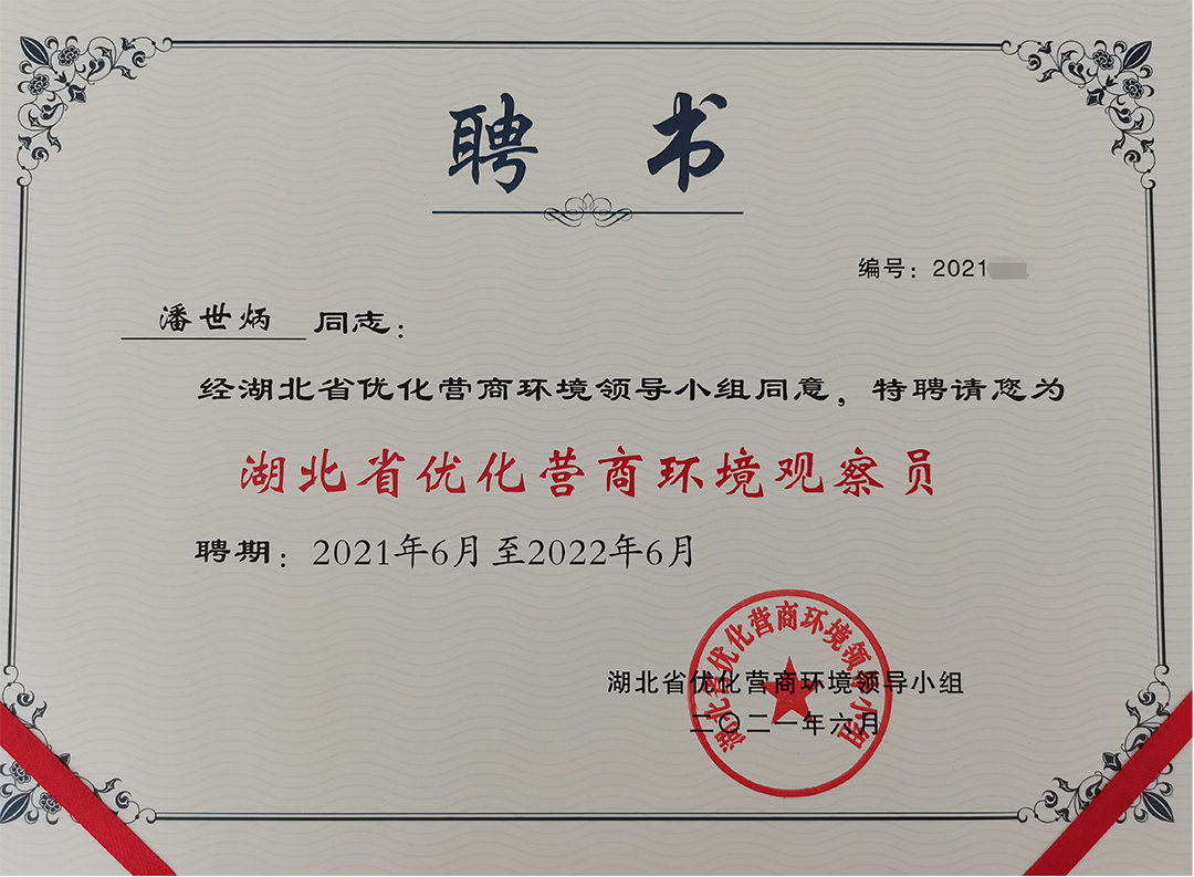 經(jīng)湖北省優(yōu)化營商環(huán)境領(lǐng)導(dǎo)小組公開選聘、省政府批準(zhǔn)同意,近日,永業(yè)行董事長(zhǎng)潘世炳受聘為湖北省首批優(yōu)化營商環(huán)境觀察員。