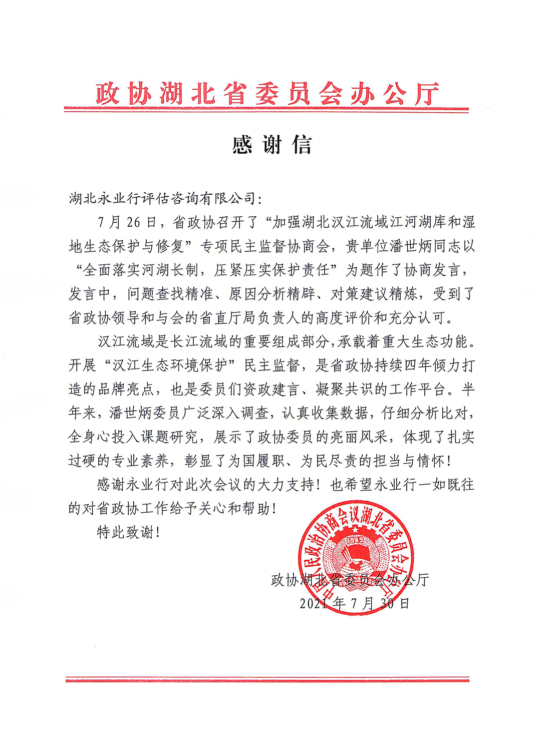 政協(xié)湖北省委員會(huì)辦公廳致函感謝永業(yè)行董事長(zhǎng)潘世炳同志