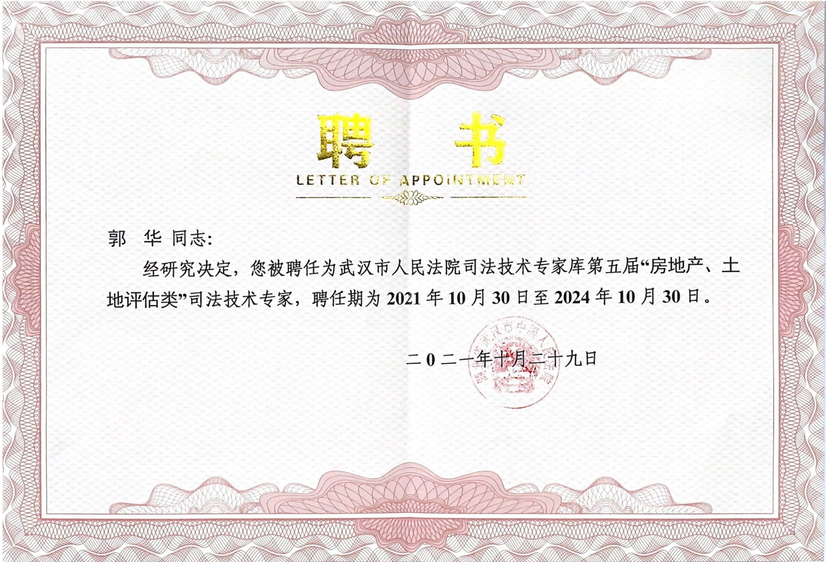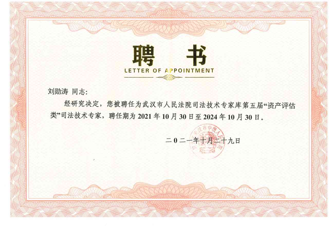 為了進(jìn)一步提高司法鑒定的科學(xué)性、公正性及客觀性,2021年8月武漢市人民法院啟動(dòng)第五屆司法技術(shù)專家選聘程序。經(jīng)個(gè)人申請,各行業(yè)協(xié)會(huì)、學(xué)會(huì)、單位推薦、考核公示,最終選聘七類、共47名專家入庫。永業(yè)行資產(chǎn)與財(cái)稅咨詢事業(yè)部總經(jīng)理劉勛濤受聘為“資產(chǎn)評(píng)估類”司法技術(shù)專家,不動(dòng)產(chǎn)事業(yè)群常務(wù)副總經(jīng)理郭華受聘為“房地產(chǎn)、土地評(píng)估類”司法技術(shù)專家。
