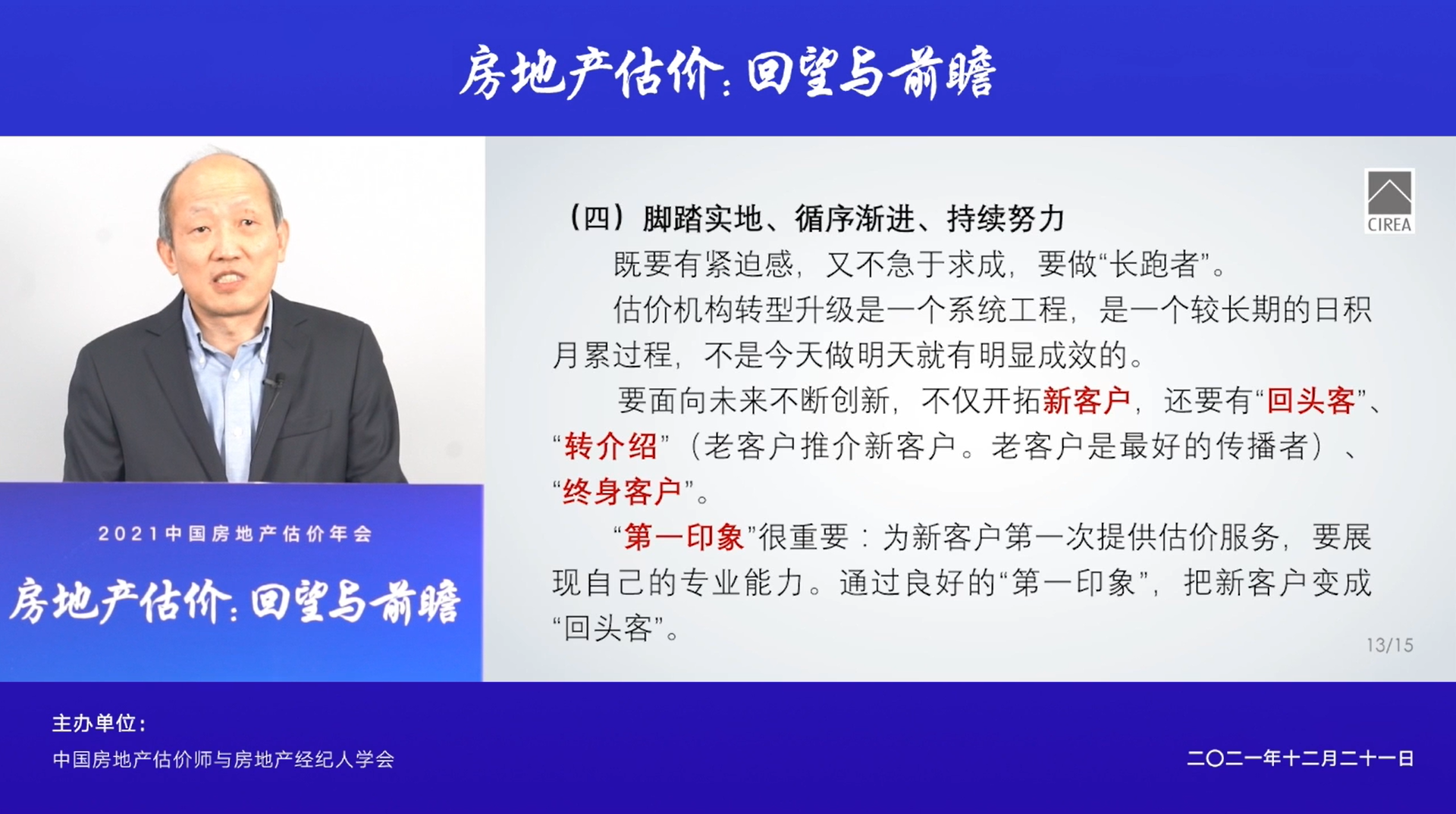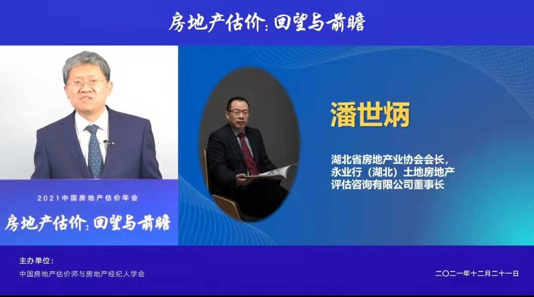 2021年12月21日,中國房地產(chǎn)估價(jià)師與房地產(chǎn)經(jīng)紀(jì)人學(xué)會(huì)(以下簡稱“中房學(xué)”)在北京召開中國房地產(chǎn)估價(jià)年會(huì)。根據(jù)當(dāng)前疫情防控要求,本次會(huì)議以線上方式舉辦。中房學(xué)會(huì)長柴強(qiáng)、中國社會(huì)科學(xué)院房地產(chǎn)金融研究中心主任尹中立等專家學(xué)者及行業(yè)領(lǐng)袖共聚一堂,回顧行業(yè)發(fā)展邏輯與趨勢,探索未來轉(zhuǎn)型升級(jí)新路徑。中房學(xué)副會(huì)長、湖北省房地產(chǎn)業(yè)協(xié)會(huì)會(huì)長、永業(yè)行董事長潘世炳受邀發(fā)表《新發(fā)展階段房地產(chǎn)估價(jià)行業(yè)創(chuàng)新發(fā)展》的主題演講。