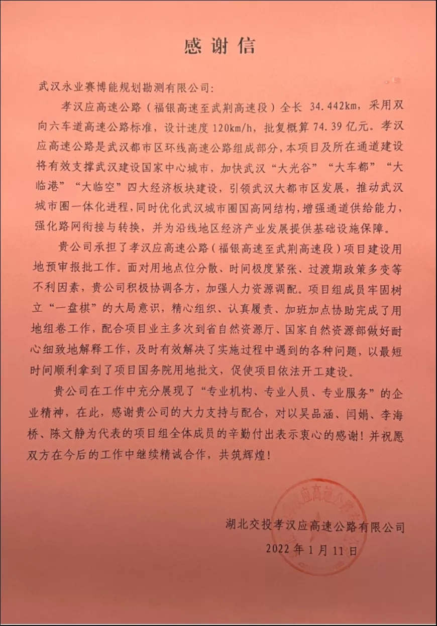 歲末年初,永業(yè)行陸續(xù)收到國家石油天然氣管網(wǎng)集團(tuán)有限公司武漢輸氣分公司、湖北交投孝漢應(yīng)高速公路有限公司及鄂州市自然資源和規(guī)劃局發(fā)來的感謝信。信中對永業(yè)行以高質(zhì)量、高效能提供的技術(shù)服務(wù),以及展現(xiàn)出的永業(yè)行人的責(zé)任和擔(dān)當(dāng)予以肯定和表揚(yáng)。滿載的贊賞和鼓勵(lì),既是對項(xiàng)目團(tuán)隊(duì)辛勤付出的高度認(rèn)可,亦是對公司品質(zhì)履約的充分肯定。