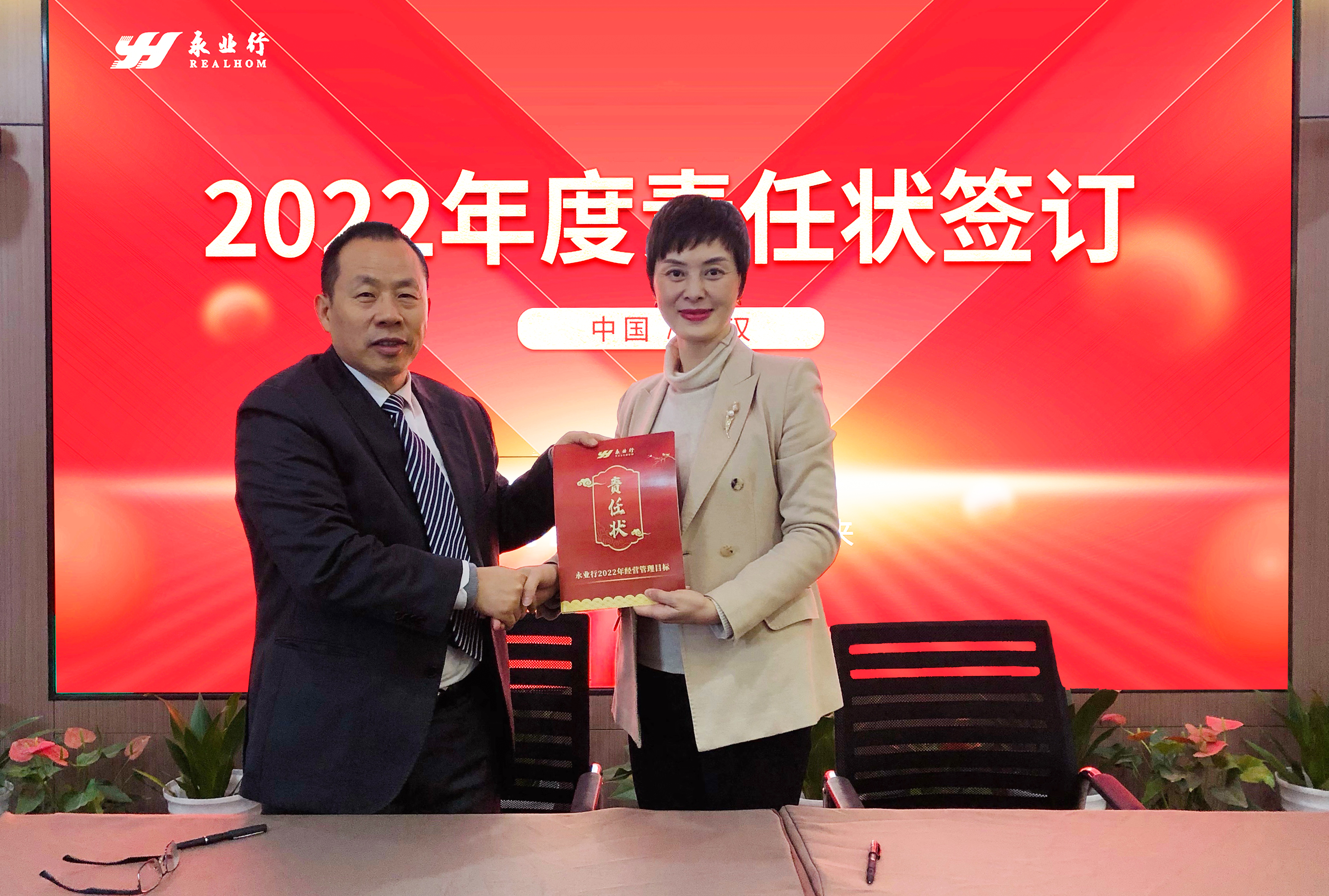 會(huì)上,潘世炳、王琴與高管及部門負(fù)責(zé)人簽訂了《2022年經(jīng)營(yíng)管理目標(biāo)責(zé)任狀》。