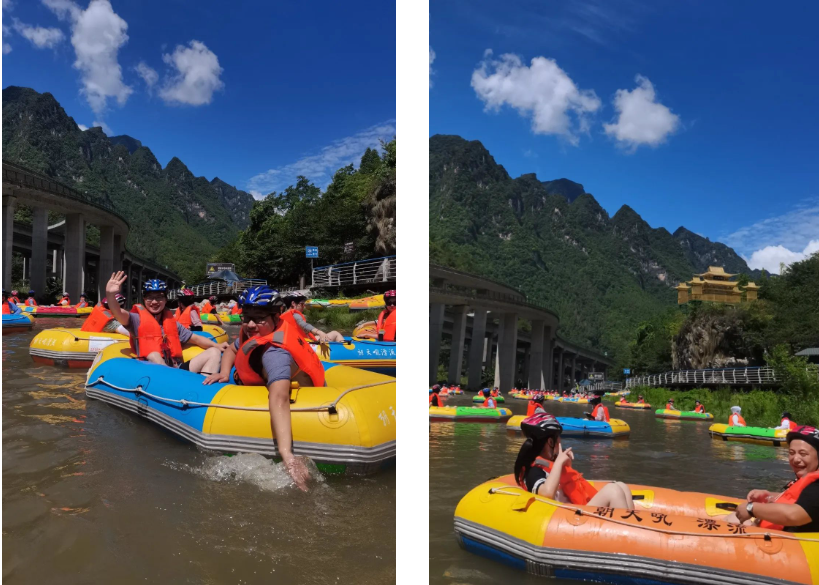 河流時而湍急時而平緩,漂流似乎喚起了大家的童心,河道中順著水流你追我趕,一旦在平坦處“相撞”少不了要一場戲水激戰(zhàn),船上伙伴兩兩合力,控制著船只瘋狂反擊,激流的呼喊聲與相撞的“戰(zhàn)斗聲”響徹山谷,飛濺的流水浸透了衣服,大家卻感到更加快樂。此刻,是同事,更像朋友兄弟,所有伙伴都深刻體會到了獨木不成林,團結(jié)才是力量的道理。