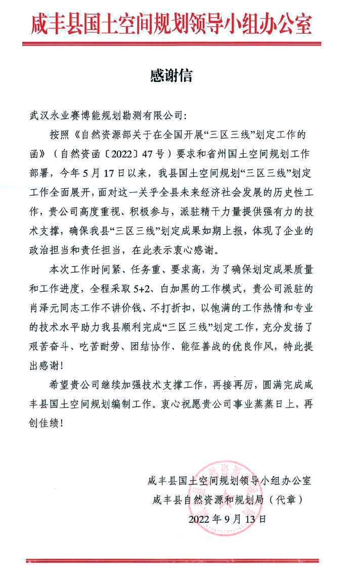 2022年9月13日,咸豐縣國(guó)土空間規(guī)劃領(lǐng)導(dǎo)小組辦公室致函永業(yè)行,對(duì)我司參與的咸豐縣國(guó)土空間規(guī)劃“三區(qū)三線”劃定工作給予肯定和感謝。