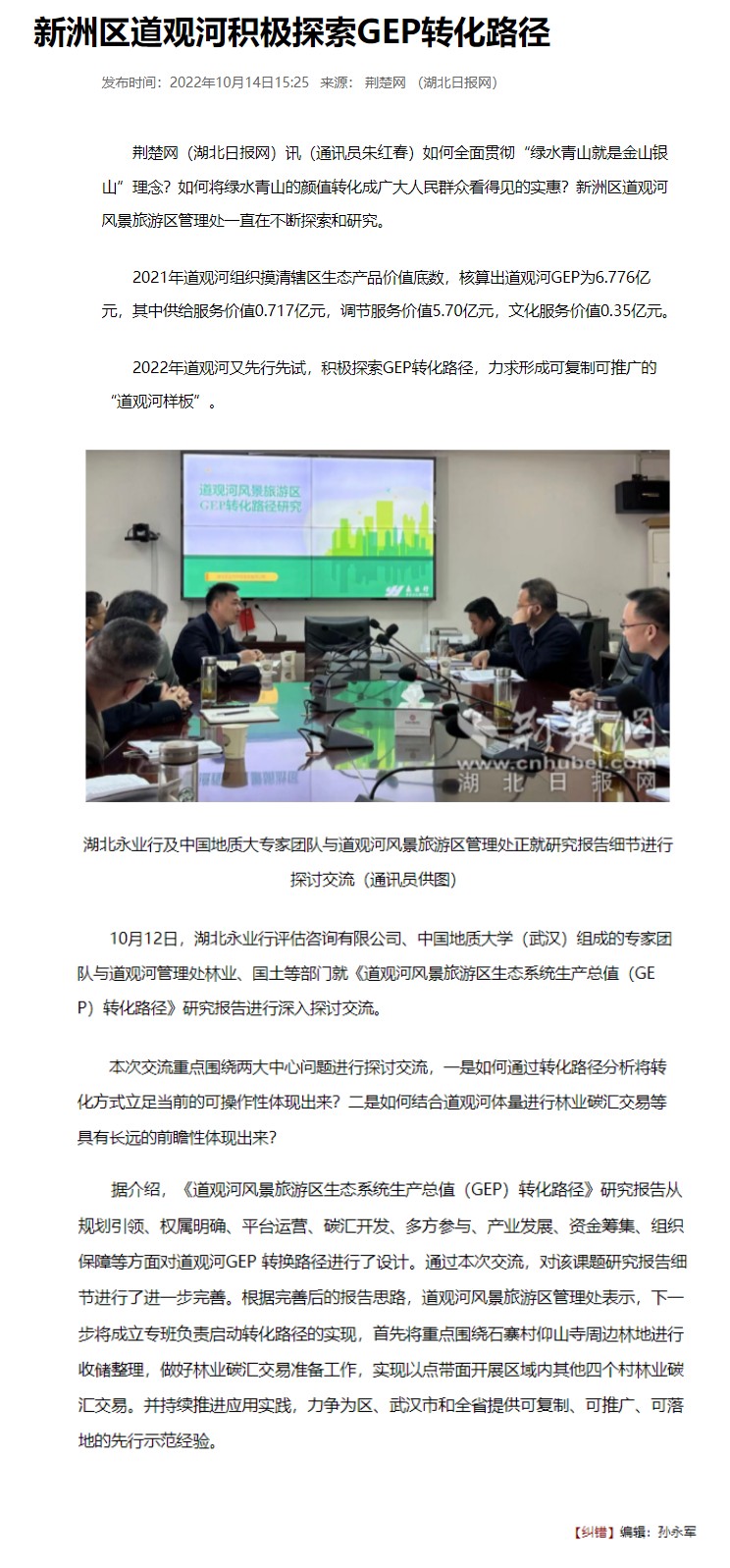 10月14日,荊楚網(wǎng)對永業(yè)行承擔的《道觀河風景旅游區(qū)生態(tài)系統(tǒng)生產(chǎn)總值(GEP)轉化路徑研究》項目進行報道。永業(yè)行碳中和研究中心項目組代表與道觀河風景旅游區(qū)管理處林業(yè)、自然資源等部門就道觀河風景旅游區(qū)GEP轉化內(nèi)容進行了深入交流與探討。中國地質大學(武漢)作為道觀河風景旅游區(qū)GEP核算單位出席座談。