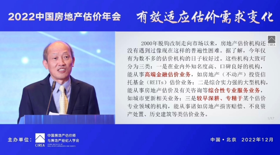 潘世炳在演講中結(jié)合黨的二十大精神以及國(guó)際國(guó)內(nèi)宏觀經(jīng)濟(jì)形勢(shì),分享了他對(duì)構(gòu)建房地產(chǎn)評(píng)估行業(yè)發(fā)展新格局的思考。他對(duì)房地產(chǎn)評(píng)估行業(yè)發(fā)展的新形勢(shì)、新要求進(jìn)行分析,提出房地產(chǎn)評(píng)估行業(yè)要以傳統(tǒng)評(píng)估和咨詢(xún)業(yè)務(wù)為基礎(chǔ),衍生新的業(yè)務(wù)渠道,構(gòu)建房地產(chǎn)評(píng)估行業(yè)發(fā)展的新格局。他指出房地產(chǎn)評(píng)估行業(yè)可從咨詢(xún)視角出發(fā),圍繞“綠色發(fā)展”“存量運(yùn)營(yíng)”等方面進(jìn)行業(yè)務(wù)創(chuàng)新;以服務(wù)現(xiàn)代企業(yè)“全生命周期”為主導(dǎo),實(shí)現(xiàn)傳統(tǒng)業(yè)務(wù)的提質(zhì)升級(jí)。他同時(shí)提出,為做好估價(jià)機(jī)構(gòu)內(nèi)部管理,評(píng)估機(jī)構(gòu)應(yīng)不斷豐富技術(shù)、市場(chǎng)、風(fēng)控、管理、信息化、文化“六位一體”的管理體系,以管理創(chuàng)新作為推動(dòng)評(píng)估行業(yè)發(fā)展的新舉措。