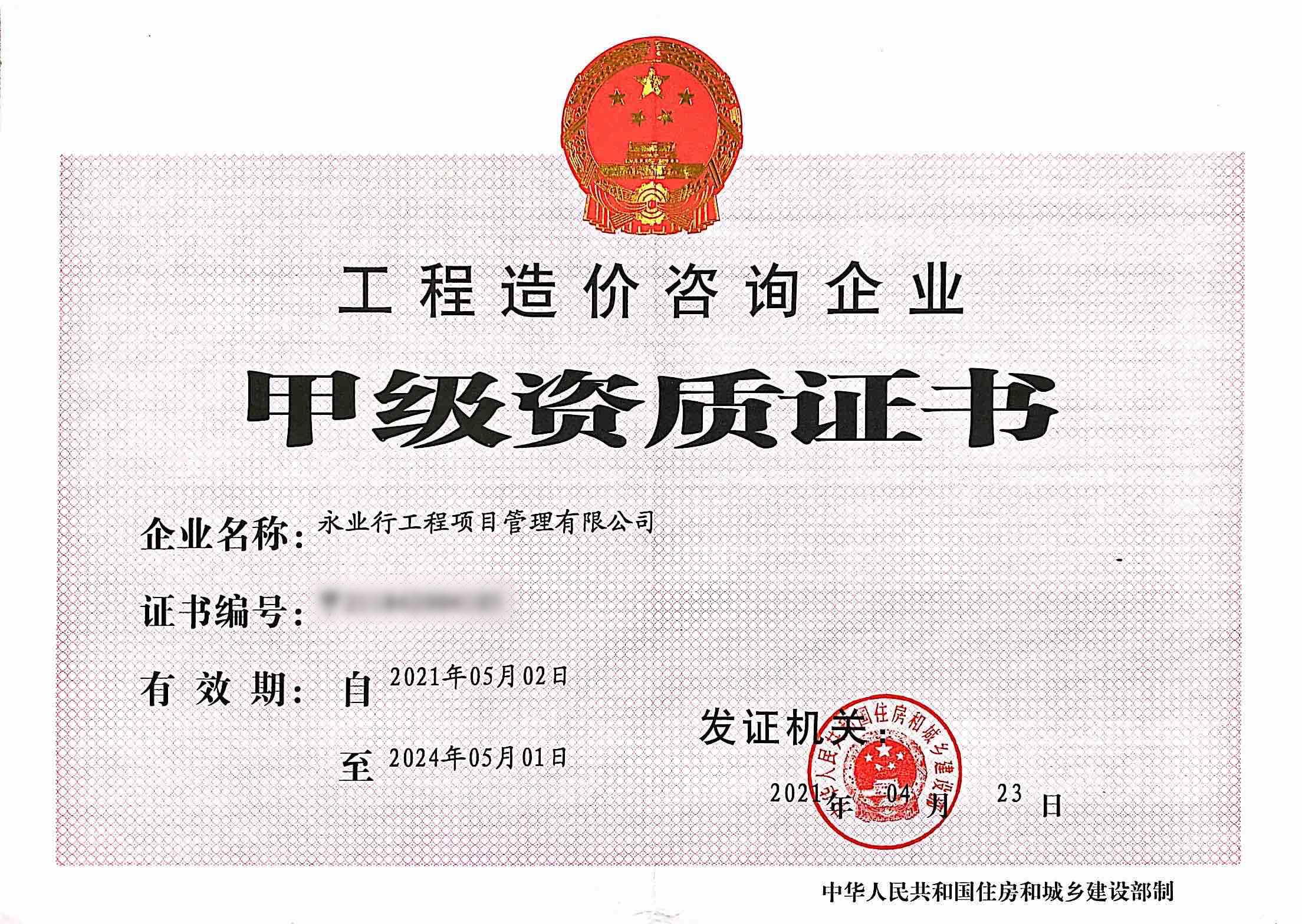 工程造價(jià)咨詢企業(yè)甲級(jí)資質(zhì)證書
