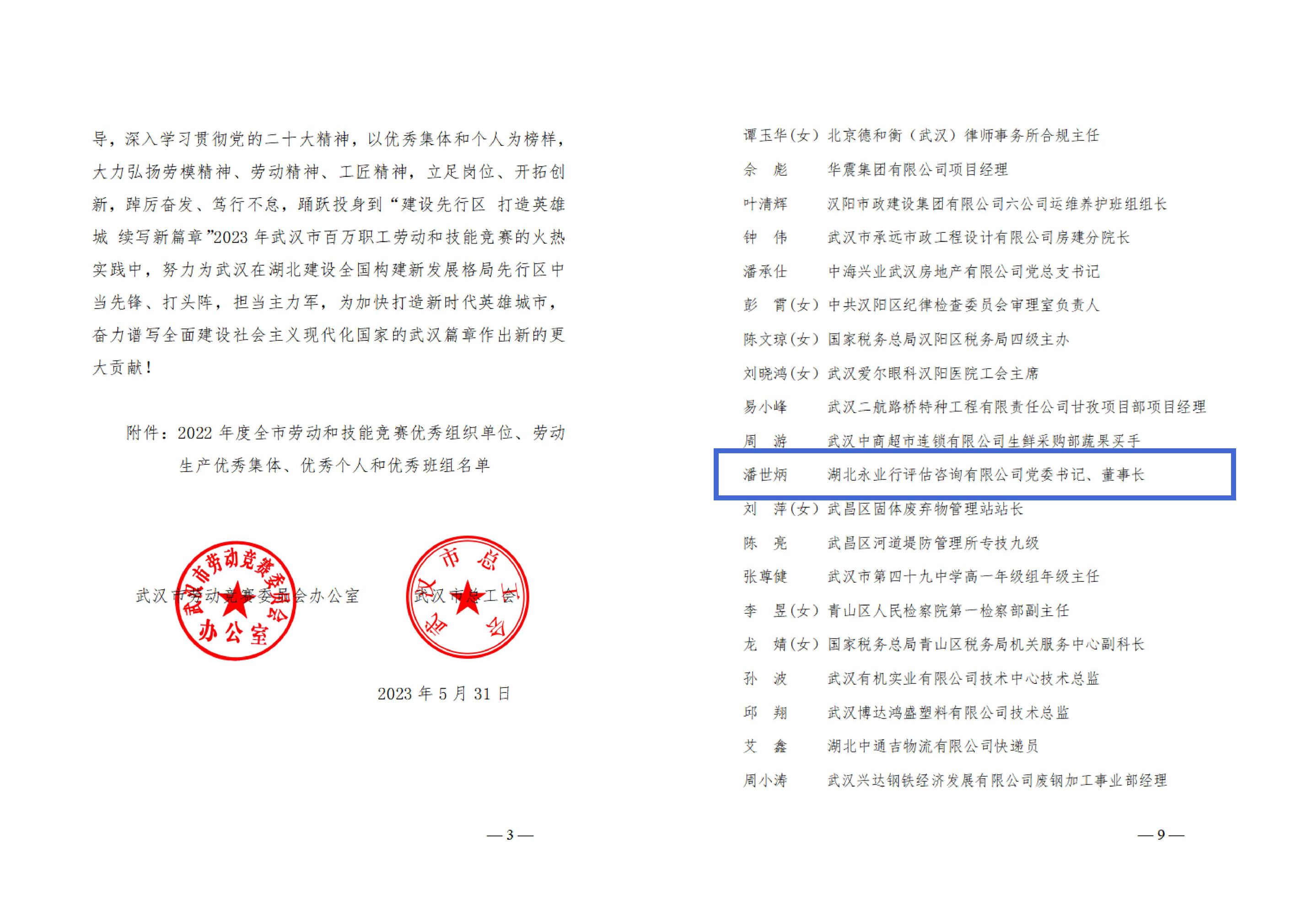 近日,武漢市勞動競賽委員會辦公室、武漢市總工會對全市19個2022年勞動和技能競賽優(yōu)秀組織單位、35個優(yōu)秀集體、266個優(yōu)秀個人、267個優(yōu)秀班組予以通報,同時對勞動生產(chǎn)優(yōu)秀集體、優(yōu)秀個人和優(yōu)秀班組分別選授為武漢五一勞動獎狀、武漢五一勞動獎章、武漢市工人先鋒號。其中,永業(yè)行黨委書記、董事長潘世炳被授予“武漢五一勞動獎章”。