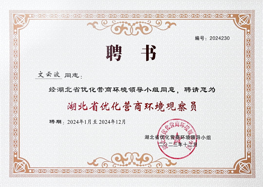 2023年12月15日下午,2024年度湖北省營商環(huán)境觀察員和監(jiān)測點負責人培訓會在武漢舉行。經湖北省優(yōu)化營商環(huán)境領導小組公開選聘、省政府批準同意,永業(yè)行獲授牌“湖北省優(yōu)化營商環(huán)境監(jiān)測點”,永業(yè)行高級副總裁文云波受聘為“湖北省優(yōu)化營商環(huán)境觀察員”。