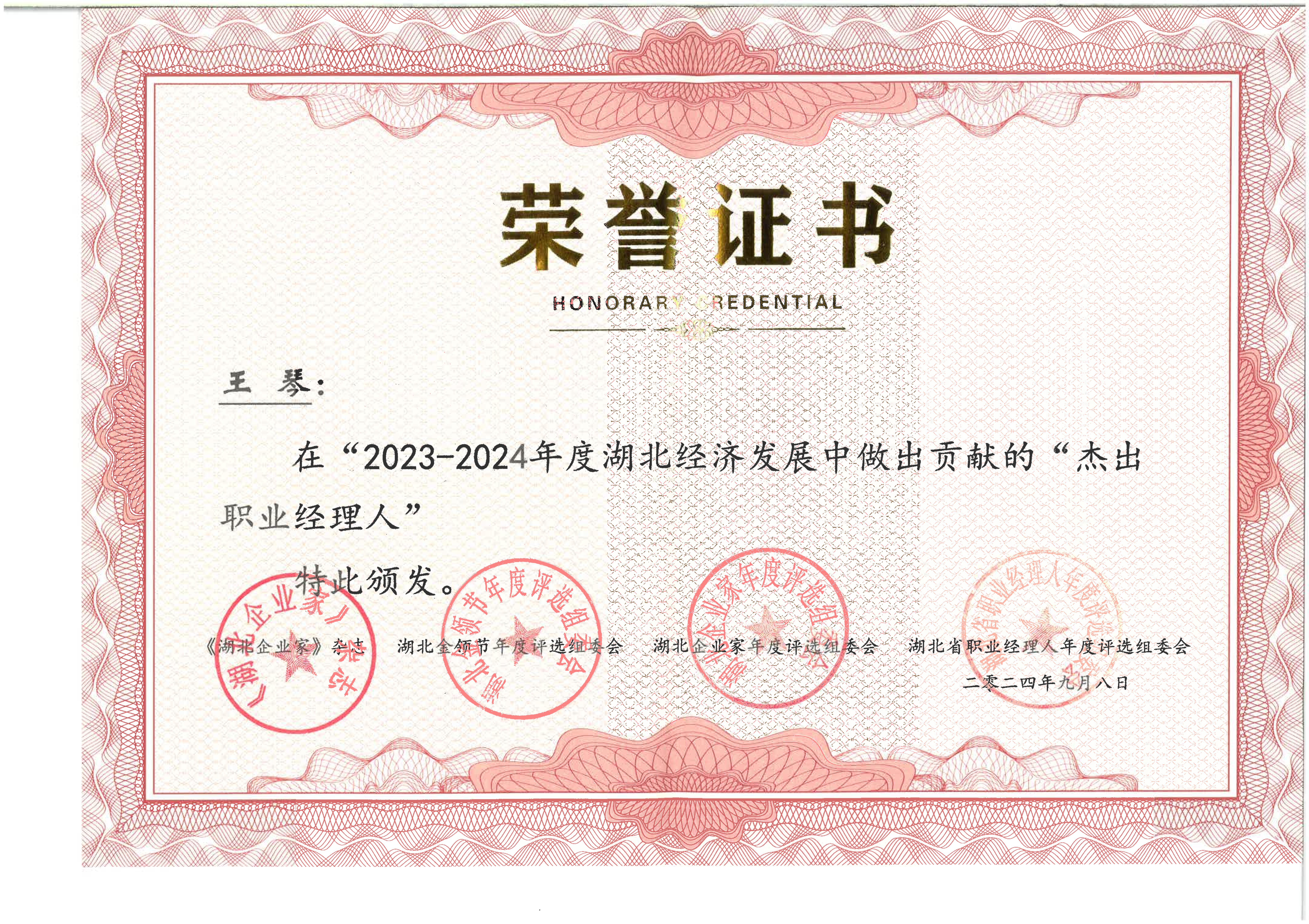 王琴榮獲2023-2024年度湖北經(jīng)濟(jì)發(fā)展中做出貢獻(xiàn)的“杰出職業(yè)經(jīng)理人”