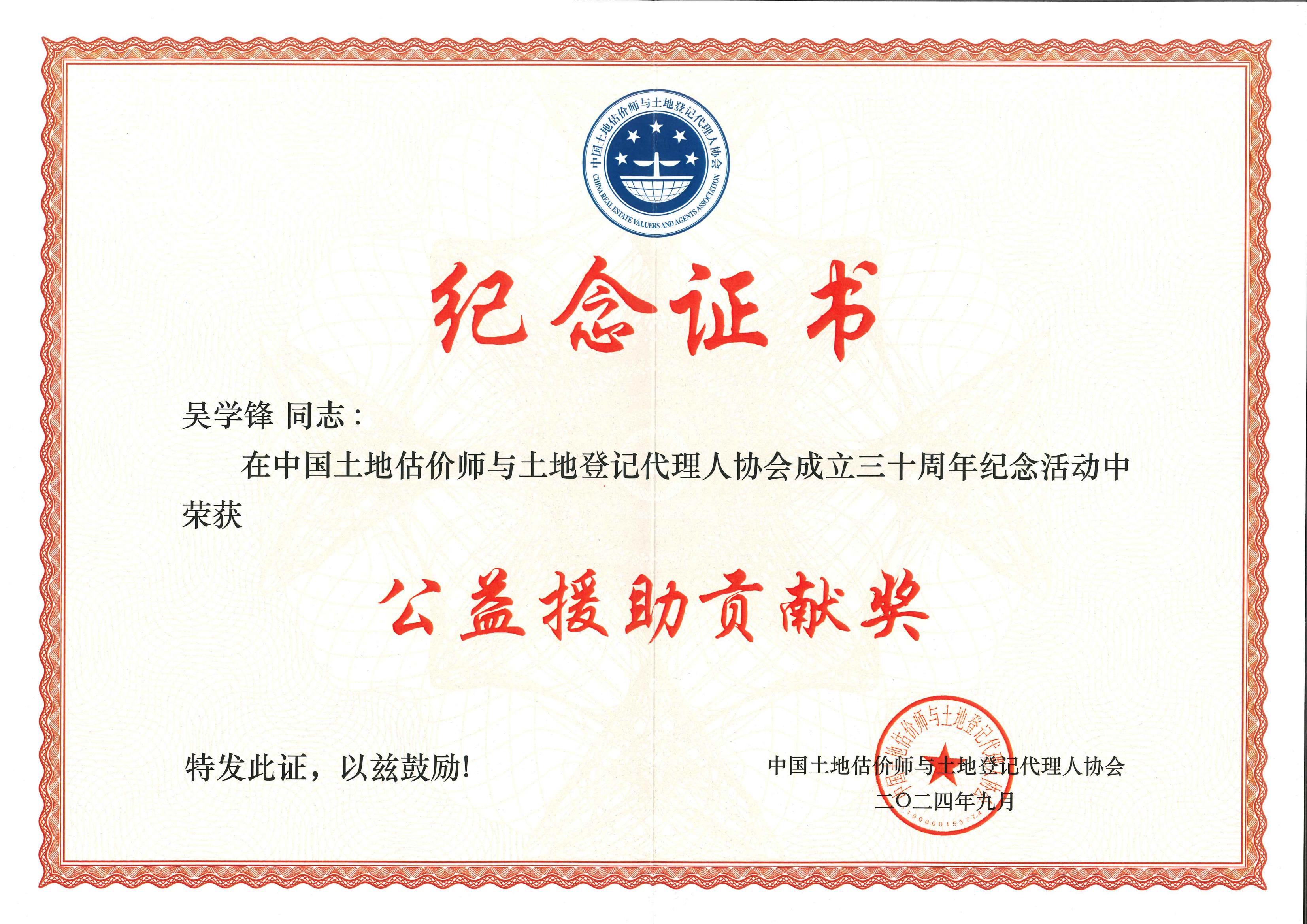 中估協(xié)30周年-公益援助貢獻(xiàn)獎(jiǎng)(吳學(xué)鋒)