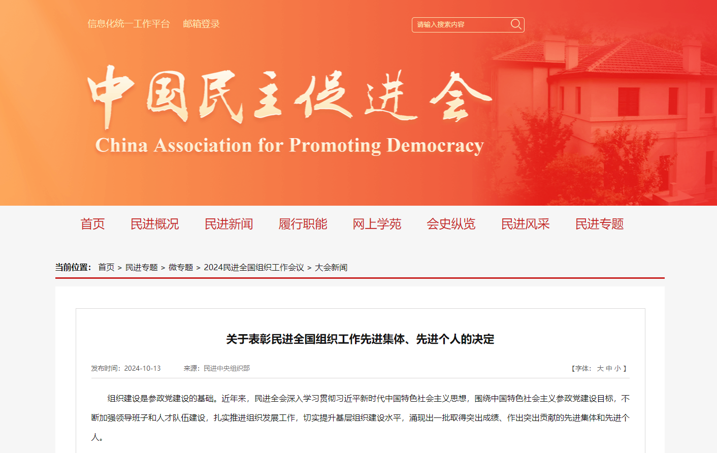 2024年10月13日,民進(jìn)全國(guó)組織工作會(huì)議在北京召開(kāi)。民進(jìn)中央主席蔡達(dá)峰出席開(kāi)幕式并講話,常務(wù)副主席朱永新,副主席王剛、高友東、何志敏出席開(kāi)幕會(huì)。會(huì)議現(xiàn)場(chǎng)宣讀了《關(guān)于表彰民進(jìn)全國(guó)組織工作先進(jìn)集體、先進(jìn)個(gè)人的決定》,并為受表彰的先進(jìn)集體和先進(jìn)個(gè)人代表頒獎(jiǎng)。永業(yè)行副總裁、民進(jìn)湖北永業(yè)行支部主委金建華榮獲“民進(jìn)全國(guó)組織工作先進(jìn)個(gè)人”榮譽(yù)稱(chēng)號(hào)。