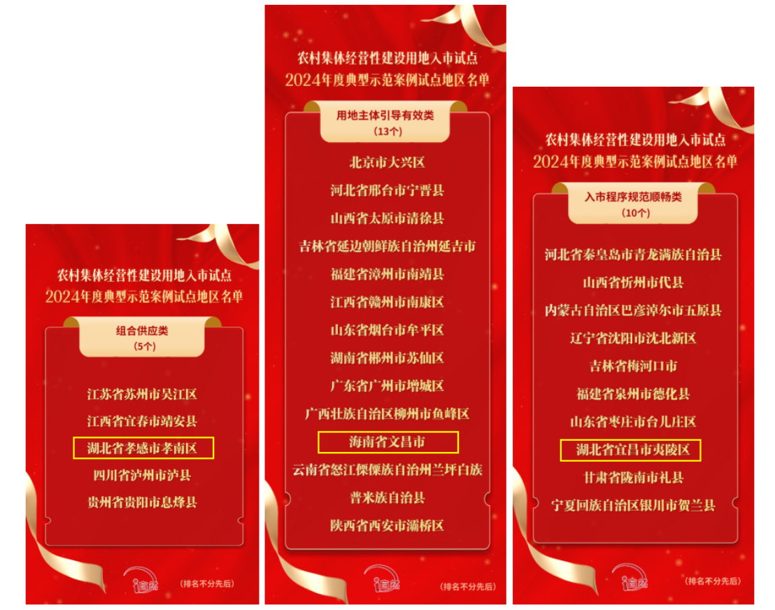 近日,自然資源部公布了《農(nóng)村集體經(jīng)營性建設(shè)用地入市試點(diǎn)2024年度典型示范案例試點(diǎn)地區(qū)名單》,全國共有44個(gè)試點(diǎn)地區(qū)入選典型示范案例,其中,永業(yè)行提供技術(shù)服務(wù)的湖北省孝感市孝南區(qū)、海南省文昌市以及參與地價(jià)評估的湖北省宜昌市夷陵區(qū)深化農(nóng)村集體經(jīng)營性建設(shè)用地入市試點(diǎn)(以下簡稱“入市”)項(xiàng)目分別被評為“組合供應(yīng)類”“用地主體引導(dǎo)有效類”“入市程序規(guī)范順暢類”典型示范案例。
