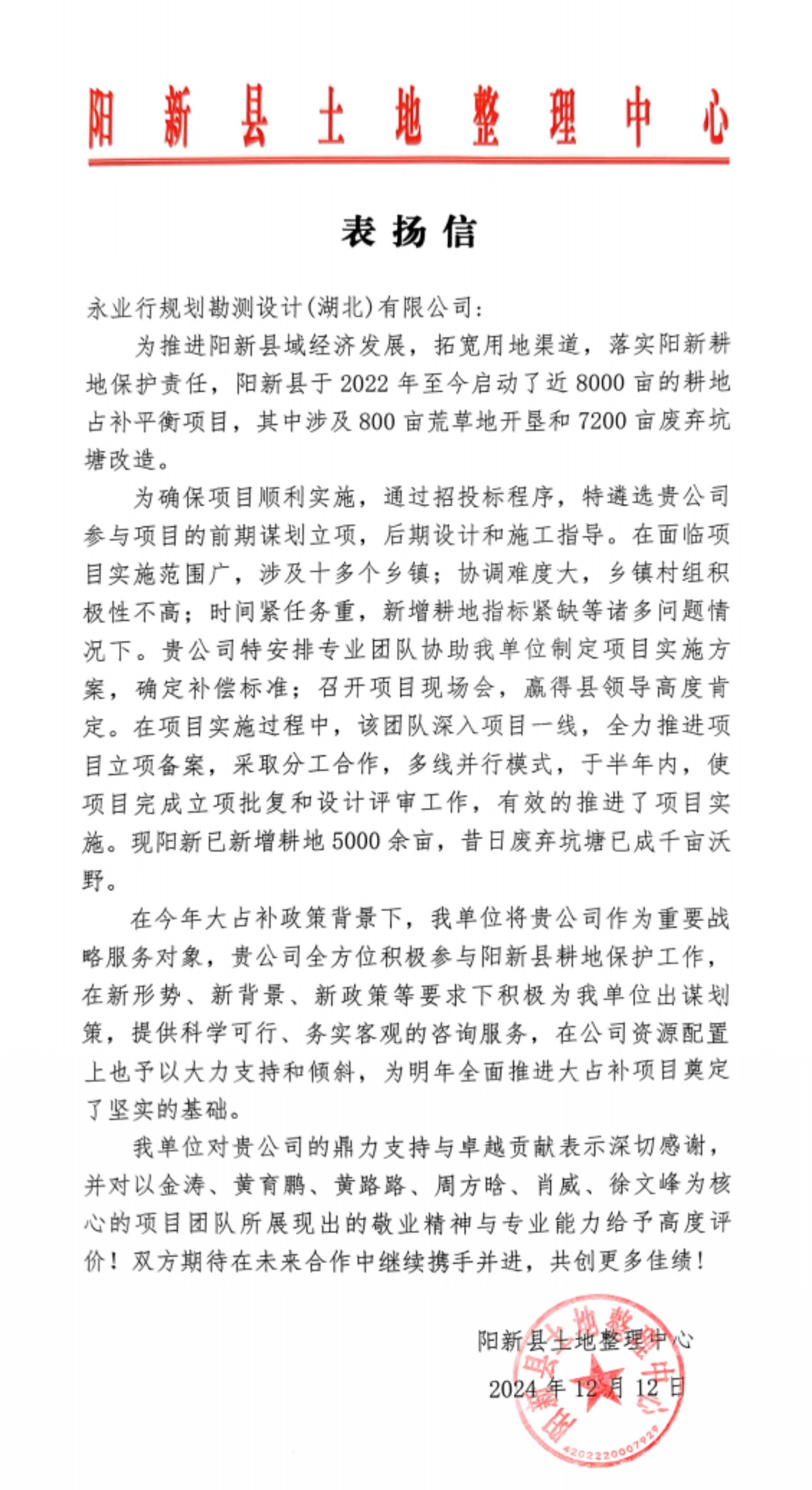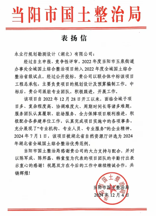 近期,永業(yè)行陸續(xù)收到了當(dāng)陽(yáng)市國(guó)土整治局、陽(yáng)新縣土地整理中心、黃石錦湖生態(tài)旅游發(fā)展有限公司等多封表?yè)P(yáng)信。信中充分肯定了我司“專業(yè)機(jī)構(gòu)、專業(yè)人員、專業(yè)服務(wù)”的企業(yè)精神,表達(dá)持續(xù)精誠(chéng)合作的美好意愿,并給予我司事業(yè)蓬勃發(fā)展,再創(chuàng)佳績(jī)的良好祝愿。