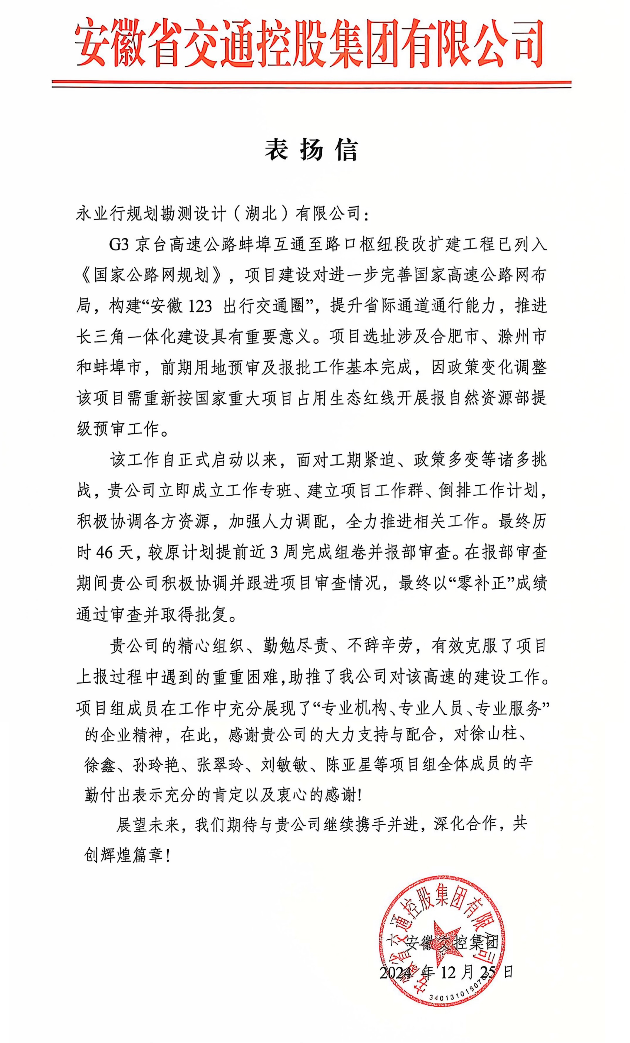 感謝信稱,G3京臺高速公路蚌埠互通至路口樞紐段改擴(kuò)建工程已列入《國家公路網(wǎng)規(guī)劃》,項(xiàng)目建設(shè)對進(jìn)一步完善國家高速公路網(wǎng)布局,構(gòu)建“安徽123出行交通圈”,提升省際通道通行能力,推進(jìn)長三角一體化建設(shè)具有重要意義。自永業(yè)行承接項(xiàng)目提級預(yù)審以來,面對工期緊迫、政策多變等諸多挑戰(zhàn),項(xiàng)目組成員(徐山柱、徐鑫、孫玲艷、張翠玲、劉敏敏、陳亞星、章磊、韓琴、房吳宇、趙勇)展現(xiàn)了高度的專業(yè)精神和職業(yè)素養(yǎng),通過對新政策、新規(guī)則的精準(zhǔn)把控,合理分解任務(wù),有效解決問題,最終歷時(shí)46天,較原計(jì)劃提前近3周完成組卷并報(bào)部審查,以“零補(bǔ)正”通過審批,獲得業(yè)主好評。