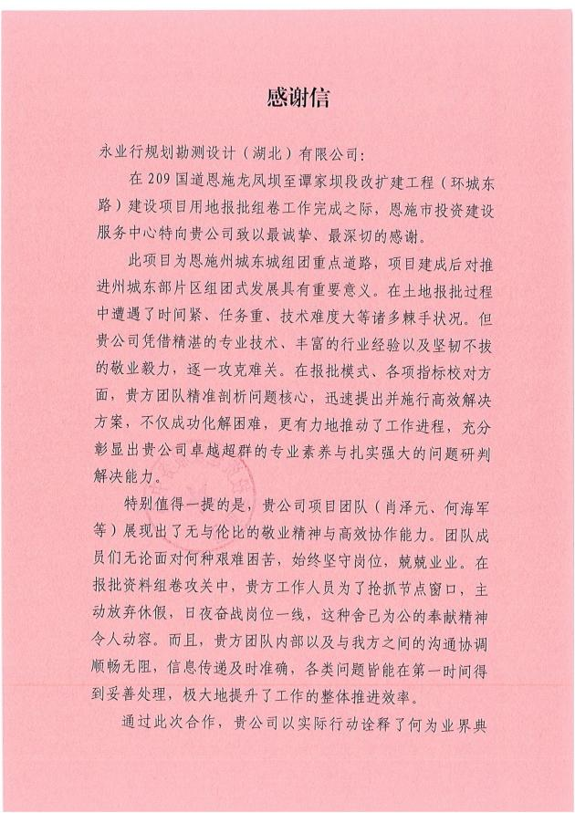 感謝信中對永業(yè)行鄂西區(qū)承擔(dān)209國道恩施龍鳳壩至譚家壩段改擴(kuò)建工程(環(huán)城東路)表達(dá)了充分的感謝,贊許了項(xiàng)目團(tuán)隊(duì)(肖澤元、何海軍)在面臨土地報(bào)批時(shí)遇到時(shí)間緊、任務(wù)重、技術(shù)難度大等問題時(shí),始終堅(jiān)守崗位、兢兢業(yè)業(yè),為搶抓節(jié)點(diǎn)窗口,主動(dòng)放棄休假,日夜奮戰(zhàn)崗位一線,展現(xiàn)出無與倫比的敬業(yè)精神和高效協(xié)作能力,團(tuán)隊(duì)內(nèi)部以及與各方之間的溝通協(xié)調(diào)順暢無阻,信息傳遞及時(shí)準(zhǔn)確,確保了問題在第一時(shí)間得到妥善處理,大大提高了工作效率,最終確保項(xiàng)目用地報(bào)批組卷工作按時(shí)完成,為項(xiàng)目的順利實(shí)施創(chuàng)造了有利條件。