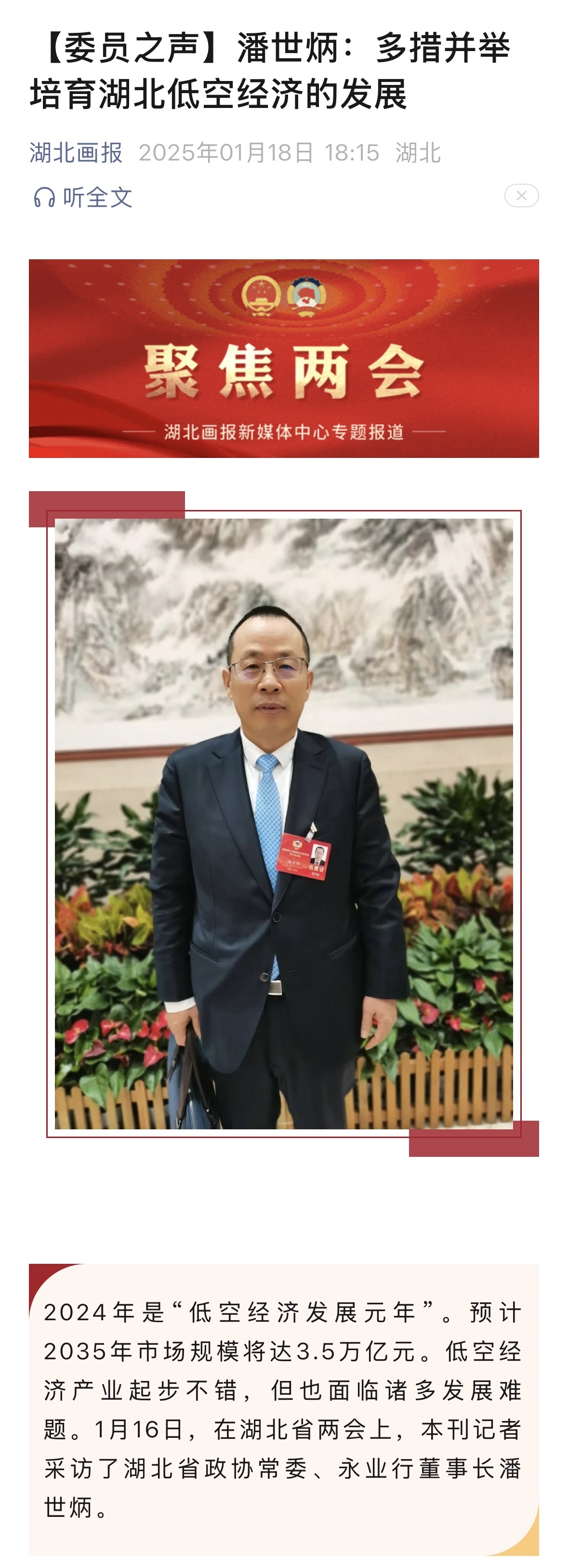 會議期間,潘世炳針對《關(guān)于著力培育湖北低空經(jīng)濟(jì)的幾點建議》接受《中國經(jīng)營報》、湖北畫報記者采訪,就低空經(jīng)濟(jì)產(chǎn)業(yè)面臨的諸多發(fā)展難題進(jìn)行深入解析,并結(jié)合困擾行業(yè)發(fā)展的空域“多頭管理”與“管理空白”現(xiàn)象提出了建立完善低空經(jīng)濟(jì)法規(guī)政策及標(biāo)準(zhǔn)體系、構(gòu)建低空經(jīng)濟(jì)規(guī)劃和協(xié)作管理機(jī)制、提高低空經(jīng)濟(jì)項目謀劃推進(jìn)質(zhì)量、加強(qiáng)低空經(jīng)濟(jì)財稅和金融支持、引導(dǎo)發(fā)展“低空+”新模式新業(yè)態(tài)、低空智聯(lián)和數(shù)字風(fēng)控建設(shè)等針對性建議。
