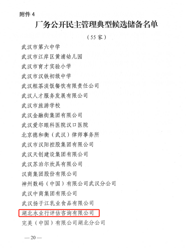 近日,武漢市總工會(huì)發(fā)布了關(guān)于2022-2024年度全市基層工會(huì)工作自查暨2024年全市企事業(yè)單位民主管理自查情況的通報(bào),對(duì)湖北永業(yè)行評(píng)估咨詢有限公司等55家廠務(wù)公開民主管理典型單位予以通報(bào)表?yè)P(yáng),并列入下一步向全總、省總推薦的廠務(wù)公開民主管理典型的候選單位。
