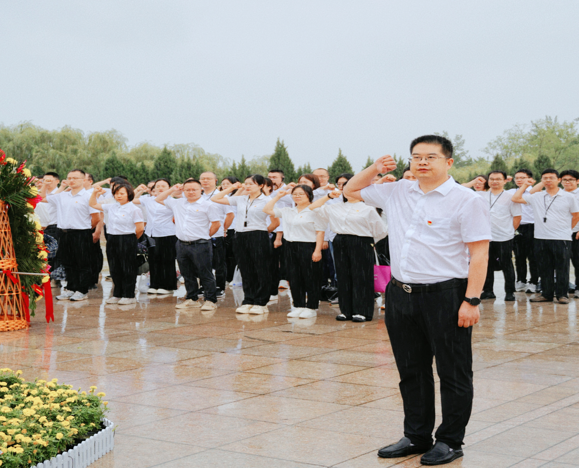 西柏坡廣場(chǎng)上,五大書(shū)記銅像矗立,全體人員整齊列隊(duì),懷著無(wú)比崇敬之情向領(lǐng)袖偉人敬獻(xiàn)花籃并深深鞠躬。隨后,大家高舉右拳,面向黨旗,重溫入黨誓詞,重拾入黨初心。