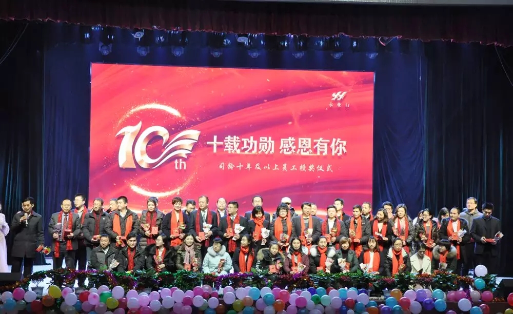 永業(yè)行成長至今,離不開一直默默付出的員工們。本次年會(huì)將走心進(jìn)行到底,特別設(shè)置了“十載功勛 感恩有你”環(huán)節(jié)。凝聚永業(yè)行人心聲的視頻短片《十年芳華 不忘初心》,讓現(xiàn)場觀眾無限感動(dòng)、一度哽咽。59名十年及以上的員工依次登臺(tái),董事長方國成、總裁潘世炳為各位老員工頒發(fā)了十年勛章及鮮花,希望他們能與永業(yè)行挽手同行,再創(chuàng)輝煌。