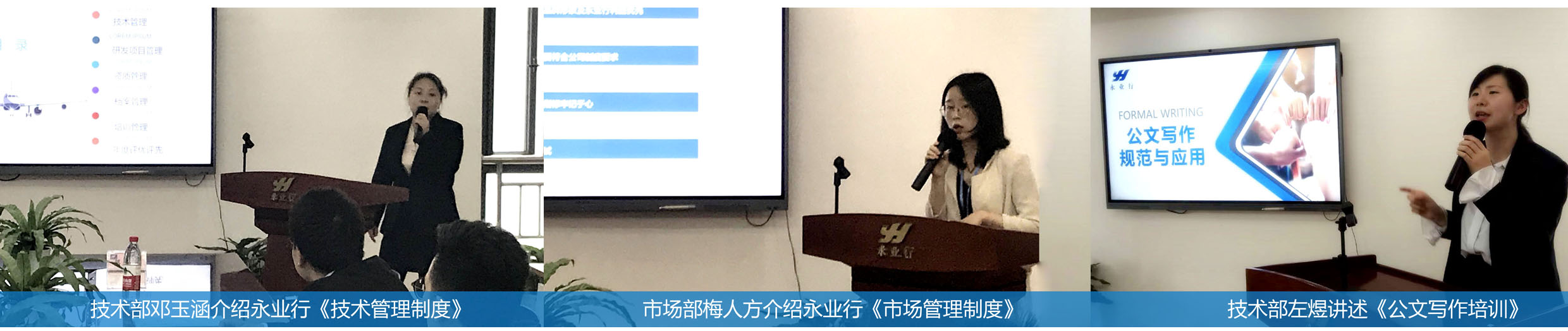 公司職能部門分別就《技術(shù)管理制度》《市場管理制度》《公文寫作》向新員工進(jìn)行培訓(xùn)。