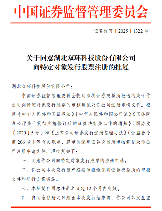 2025年6月27日,湖北雙環(huán)科技股份有限公司(以下簡(jiǎn)稱“雙環(huán)科技”)(股票代碼:000707)獲得中國(guó)證券監(jiān)督管理委員會(huì)(以下簡(jiǎn)稱“中國(guó)證監(jiān)會(huì)”)出具的《關(guān)于同意湖北雙環(huán)科技股份有限公司向特定對(duì)象發(fā)行股票注冊(cè)的批復(fù)》(證監(jiān)許可〔2025〕1322號(hào)),獲準(zhǔn)向特定對(duì)象發(fā)行股票的注冊(cè)申請(qǐng)。
